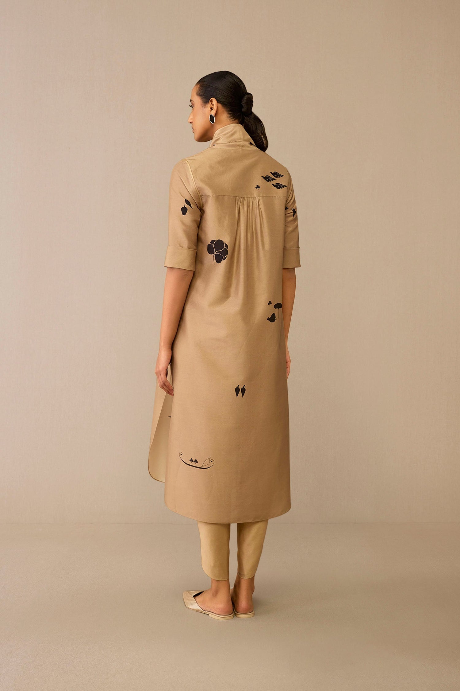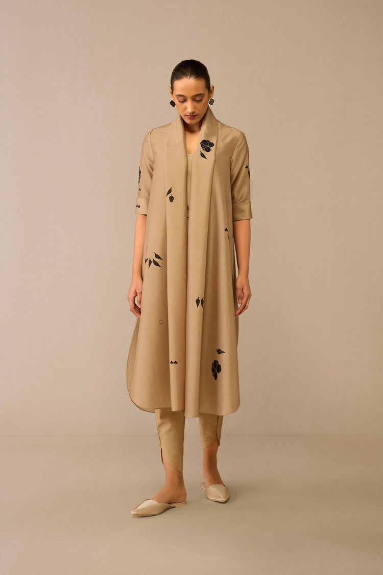 Light as a spring breeze, the Dilnar throw set captures the essence of effortless grace. Crafted from lustrous beige chanderi, its flowing throw features delicate, story-like prints of birds and blooming flowers.