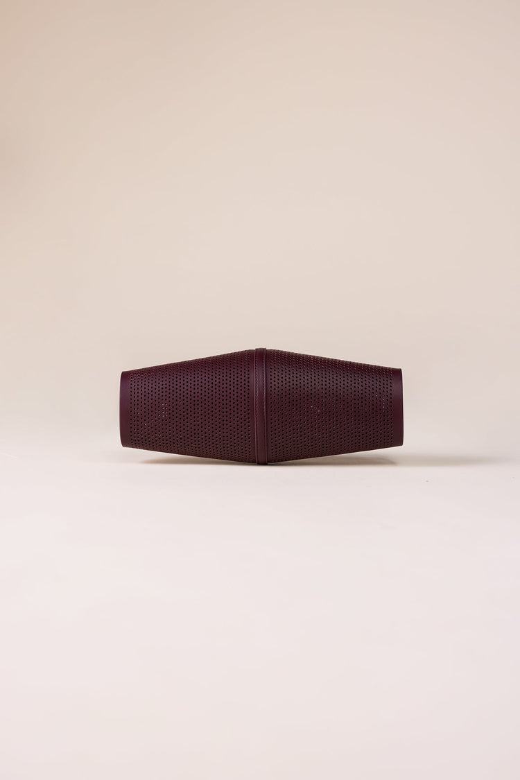 The Nilah clutch is a sculpture crafted from luxuriously soft faux leather. Wine red in colour, delicate cut-out motifs pattern the clutch, the opening marked by an embossing of AMPM’s signature motif. With a spacious interior and refined lines, Nilah is the perfect party clutch.