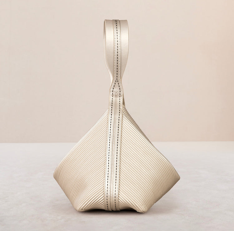 Metallic pearl bucket bag in faux leather. Delicately crafted, with a key holder and card slots inside. Ruh is made for the festive season.