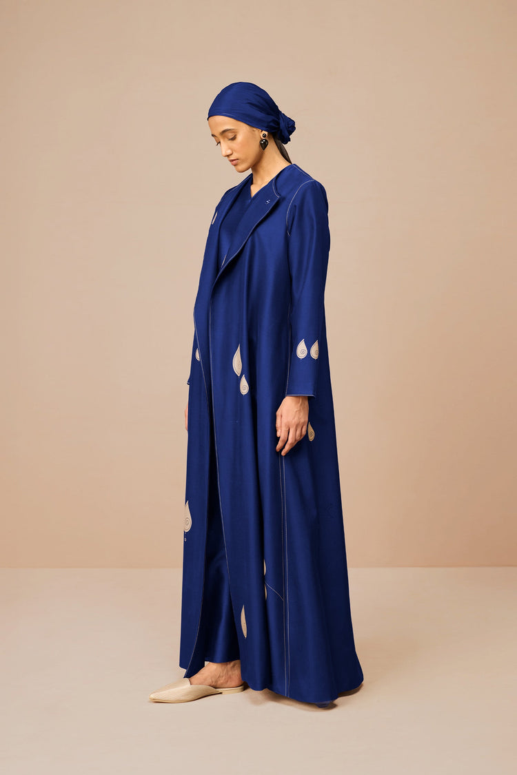 Like a lake shimmering under the midnight sky, Azar's deep indigo colour gleams under the sunlight. Made of luxe cotton silk, light and airy, Azar is a simple jacket set where the details shine. A wide lapel, ivory paisley prints arranged like falling raindrops and blooming flowers on the sleeves make the set. A small abstract horse charm shines on the lapel.