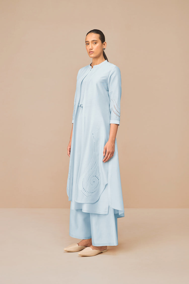 The gentle shimmer of ice blue chanderi (cotton silk) offset by precise dori embroidery makes Anais an expression of AMPM's Modern Indian vision.