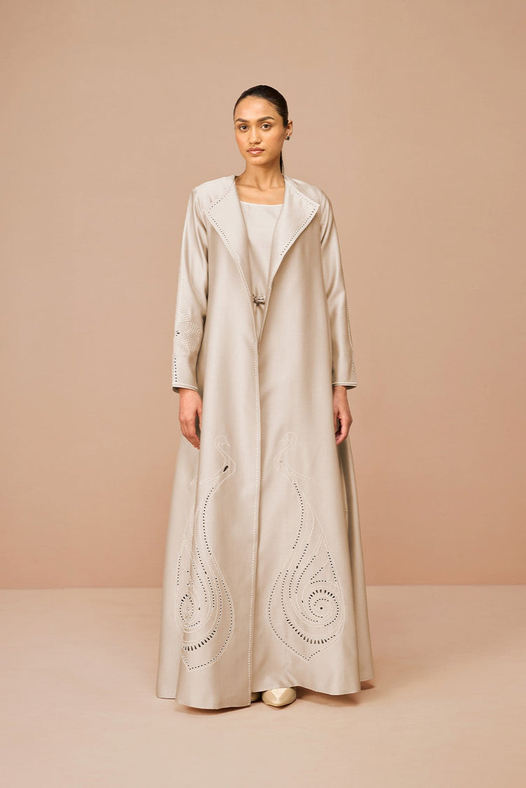Meet Raysa, the jacket set that glimmers under the summer sun. Delicate chanderi (cotton silk) serves as a canvas for intricate cut-work, resham and dori embroidery, taking the form of peacocks and blooming flowers. Accompanied by an inner dress with a soft square neckline in the same soothing beige and a faux leather belt.