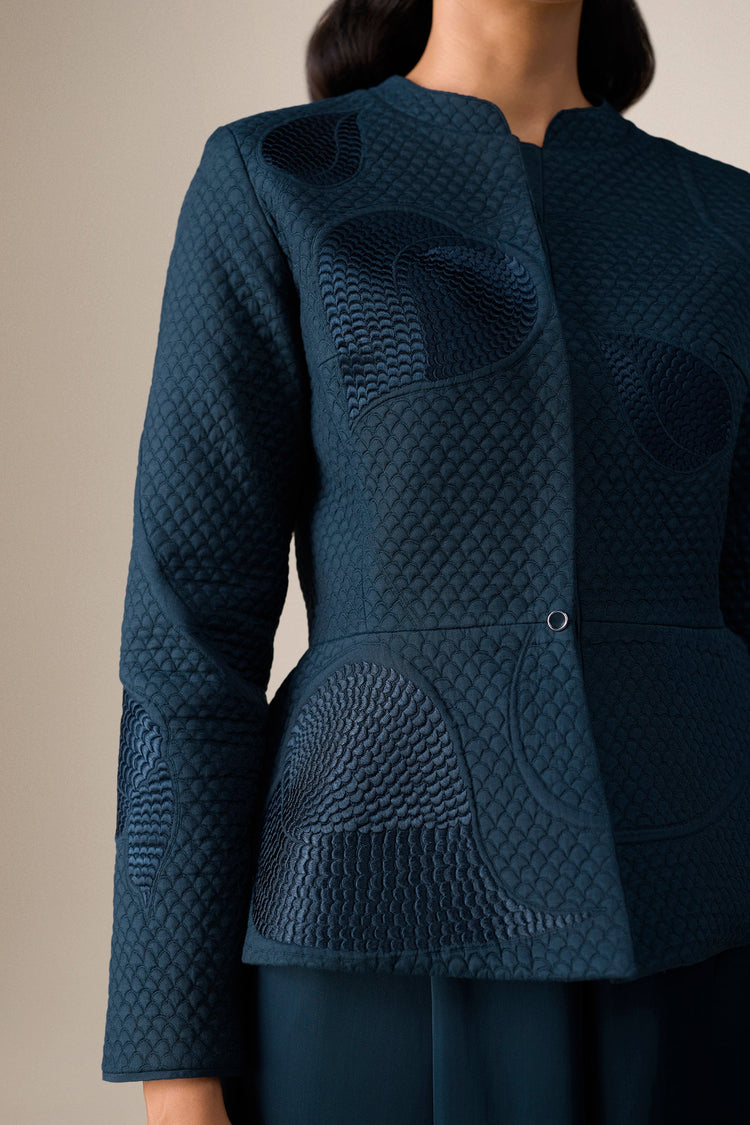 "The flora and fauna of the natural world come together against the intricate quilting and fine resham embroidery of the Valla jacket. In a gleaming dark blue silk blend, fluid lines of parrots and AMPM’s signature paan leaf motif take shape in silk thread.